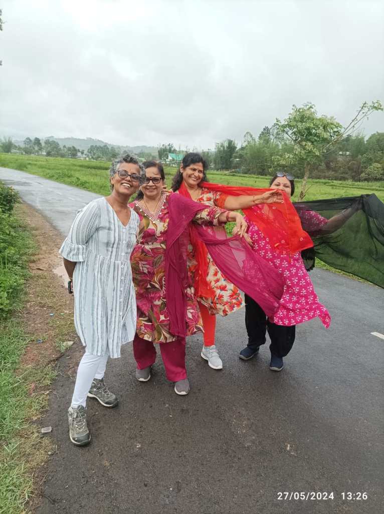 We are nine friends (4 couples plus one) on this trip. All men are classmates from their twenties and women are the spouses. These men hardly share any secrets – they would be taking about politics often but we women are pals for the past 25 odd years and share all details. The men enjoy all our female chatter and we enjoy pulling their legs. We had loads of time as it was raining outside and we were in the 13-seater traveler, travelling for more than 4-5 hours each day cooped in. Hubby would come out with silly jokes and Sunita will give him quick retorts.. this went on for few times and hubby coined a name for Sunita “Mirchi Kumari”. Archana was one who would be out in front to fight for our needs and hubby dear names her “Phoolan Kumari” and would add “ yeh le ja apna bandook bhi leti jaa”. 😀 Another spouse is named “Mathrri kumari” as she always has “namkeen mathrri “ … At one point, I was trying to reason with hubby but he was stuck to his view and I said – tum to ekdum jiddi ho – and we women named him “Jiddi Kumar” similarly another man became “Prashhna kumar” as he would ask lot of questions, and so on. There would be lot of laughter and sometimes we would be frustrated with each other… but we were very sure from the beginning that we will travel in one large vehicle even if it was a costly affair(compared to hiring two smaller vehicles). So we had arranged for this 13 seater for 6 days in Meghalaya.